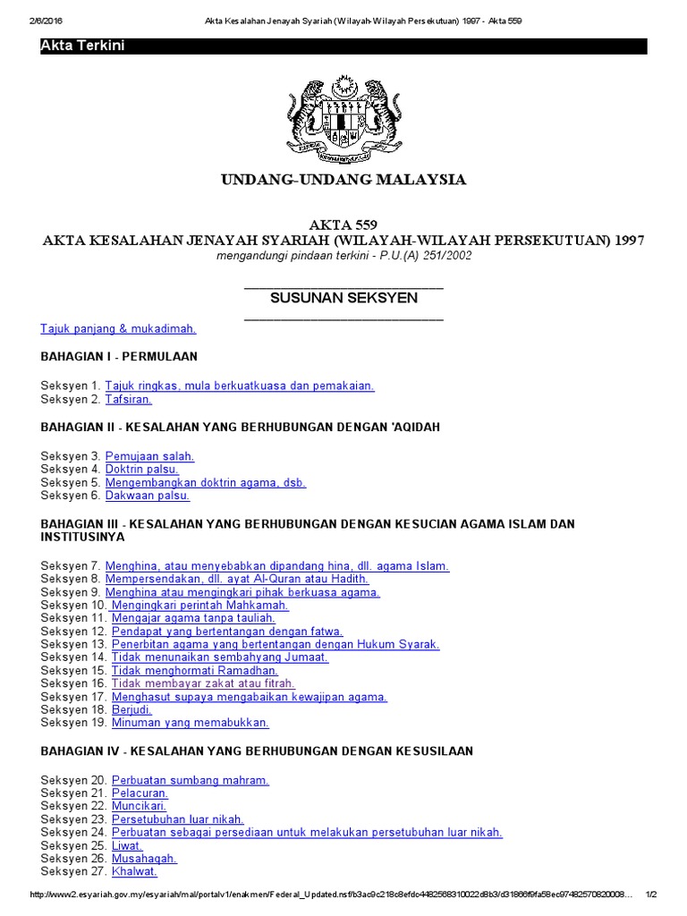 Akta Kesalahan Jenayah Syariah Wilayah Wilayah Persekutuan 1997 Akta 559 Pdf
