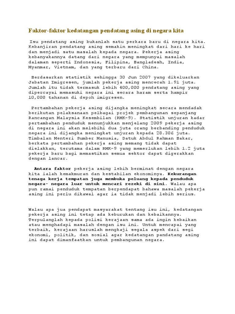 Semua kemudahan inilah yang menjadi faktor tarikan pekerja asing untuk mencari pekerjaan di Malaysia. Kedatangan pekerja asing contohnya tenaga buruh mahir dan separuh mahir ke Malaysia membolehkan negara mempelajari dan memperoleh teknologi baru melalui program usaha sama yang dilakukan oleh pihak kerajaan atau organisasi tertentu. FAKTOR KEDATANGAN PENDATANG ASING DI MALAYSIA Isu pendatang asing bukanlah satu perkara baru di negara kita.