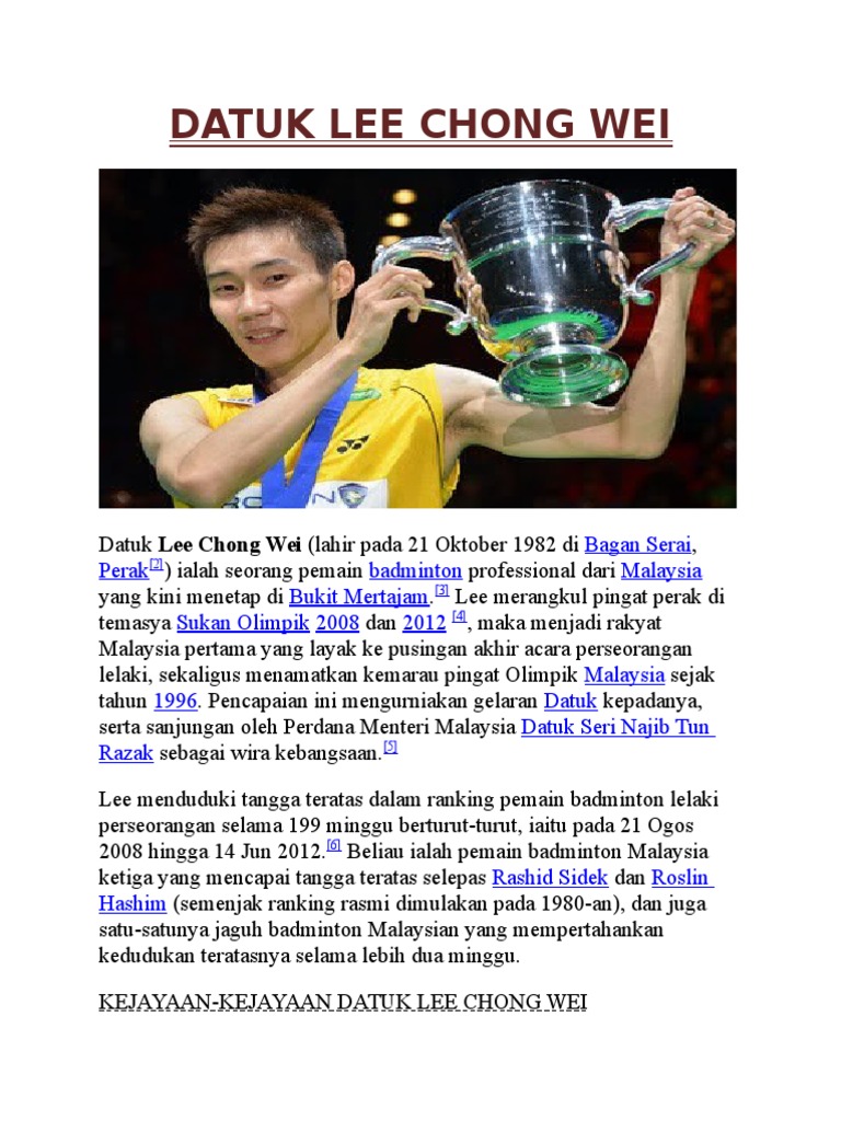 DATUK LEE CHONG WEI DILAHIRKAN DI PENANG BELIAU BERMAIN BADMINTON PADA ZAMAN KANAK -KANAK LAGIBELIAU BERJAYA MENYUMBANGKAN PINGAT PERAK OLIMPIK PADA 2008 DAN 2012BELIAU BERJAYA KERANA BERLATIH BERSUNGGUH-SUNGGUH DENGAN PENUH KEAZAMAN. Tak ramai yang tahu bahawa Datuk Nicole kini menjadi ikon kejayaan yang bertaraf dunia. Pada 14 Mac pada percubaan ketujuh menjuarai Kejohanan All-England sepanjang kerjayanya Lee akhirnya.