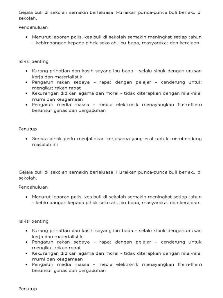Anda telah menyertai pertandingan syarahan anjuran Persatuan Bahasa Melayu sekolah anda. Faktor dalaman pula ialah tiada didikan agama yang semantapnya kurang perhatian ibu bapa. Buli yang berlaku dalam kalangan pelajar sekolah terjadi melibatkan pelbagai faktor sama ada faktor luar mahupun faktor dalaman.