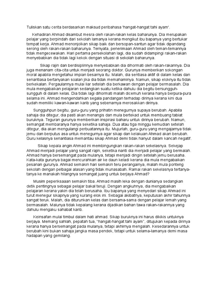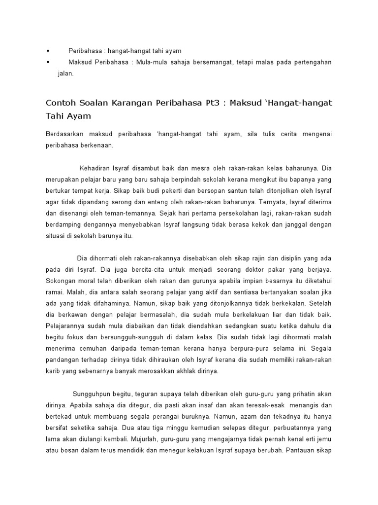 Semoga anda dapat gunakan koleksi karangan bahasa melayu pt3 ini untuk mendapatkan markah yang tinggi dalam peperiksaan bahasammelayu pt3 yang sebenar kelak. Menurut Kamus Besar Bahasa Indonesia KBBI arti hangat hangat tahi ayam adalah kemauan yang tidak tetap atau tidak kuat. Sesal dahulu pendapatan sesal kemudian tiada gunanya.