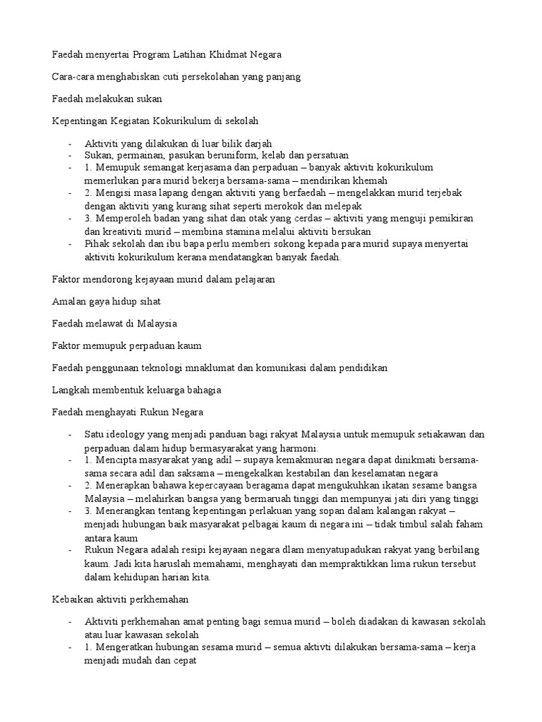 Negara kita telah mengadakan satu program khas yang dipanggil sabagai Program Latihan Khidmat Negara PLKN. FAEDAH PROGRAM LATIHAN KHIDMAT NEGARA Dalam keasyikan menari bersama bayang-bayang pembangunan yang semakin rancak pada zaman pascakemerdekaan ini Malaysia telah mampu berdiri sama tinggi dan duduk sama rendah dengan negara-negara moden yang lainSehubungan dengan itu kerajaan telah mengambil inisiatif baru untuk mengekalkan prestasi negara dengan.